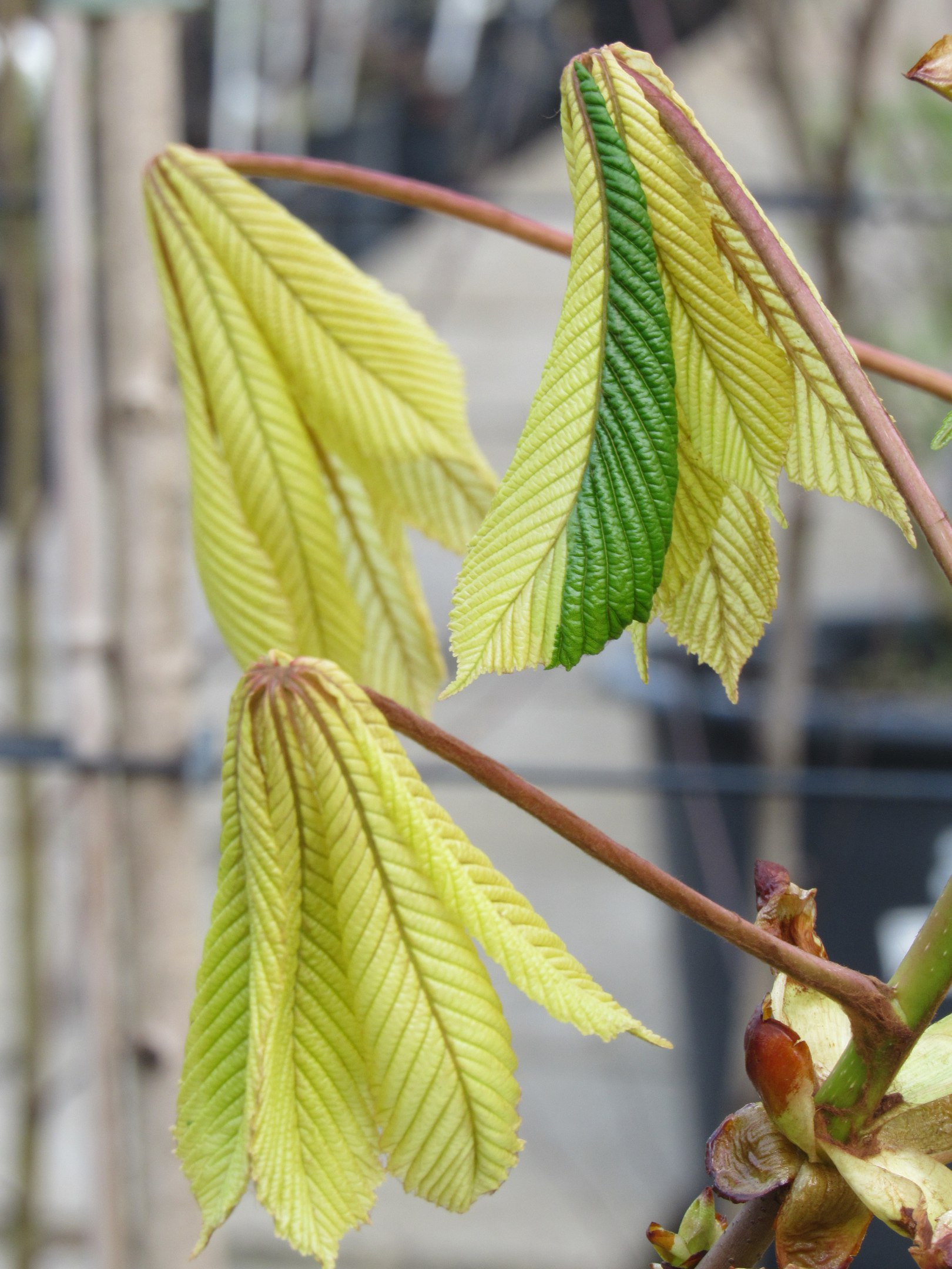 Это листопадное дерево, вырастает в высоту до пятнадцати метров. А ширина его может составить 7-8 метров. Крона плотная, конической формы. Листья пальчатые, с 6-7 узкими листочками. Первоначальный их цвет, при распускании, розовый. По мере взросления они меняют цвет на кремово-желтый. Растет этот каштан довольно медленно