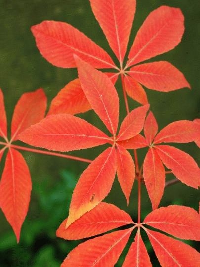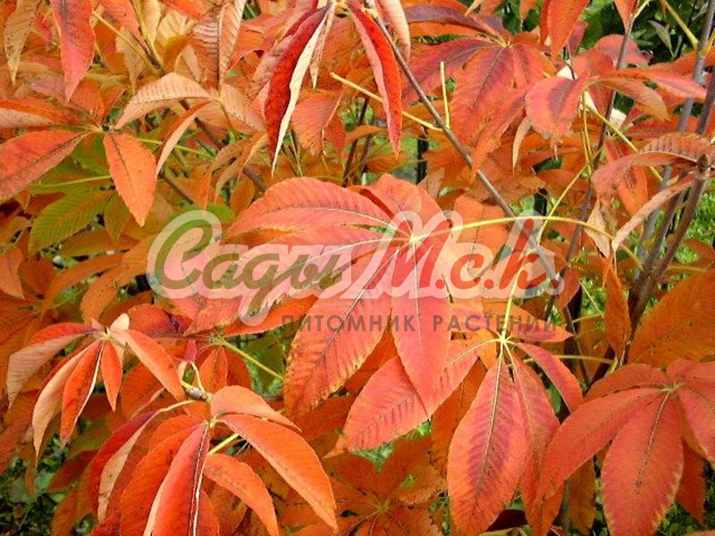 Каштан конский незамеченный. Замечательное небольшое деревце высотой 150 см. Ранние листья медного цвета, постепенно к лету становятся темно-зелеными. Осенью листва меняет окраску и переливается от желтого до оранжевого, а затем становится ярко-красного цвета. Цветет в мае-июне бело-кремовыми цветочками, собранными в прямостоячие пирамидальные кистевые соцветия. Место посадки - солнце-полутень. Используется в одиночных, солитерных посадках.