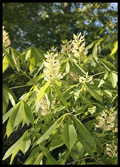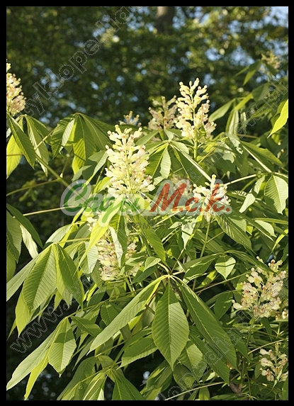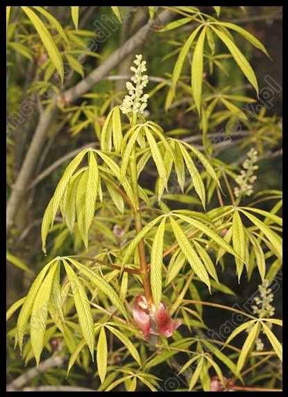 Листья сложные из 5 листочков, на коротких черешках. Листья продольно-обратнояйцевидные, длиной до 15 см, длинные заостренные. В молодости коричневатые, потом зеленые, на нижней стороне жёлтоватые. Осенью они красным цветом.