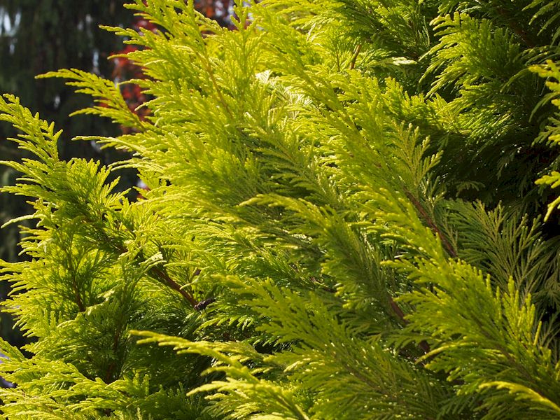 Кипарисовик Alumigold - сорт с компактной, конусовидной формой. Высота взрослого растения (6) 8-10 м, ширина 2-3 м. Годовой прирост в высоту 15-20 см, в ширину 5-10 см. Ветви очень декоративные выпрямленные. Молодая хвоя золотисто-желтая, позже – желто-зеленая. Долговечен, светолюбив, нетребователен, предпочитает плодородные супеси и суглинки, переносит известковые почвы, не переносит сухости почв. Дымогазоустойчив, переносит формировочную стрижку.