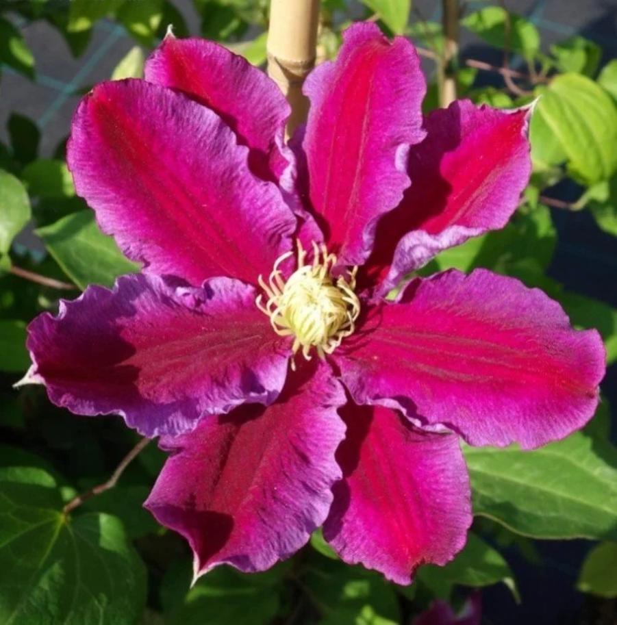 Клематис Hania - именитый сорт польского происхождения. Крупные двухцветны цветки этого клематиса бархатистые, ярко- красные, с розовой окантовкой и золотистого оттенка тычинками посередине. Период цветения - май-июнь и август-сентябрь. Диаметр цветков - 14-16 см. Молодая листва отличается бордовым оттенком. Растение вырастает до 2,5 м. Предпочитает полутень.