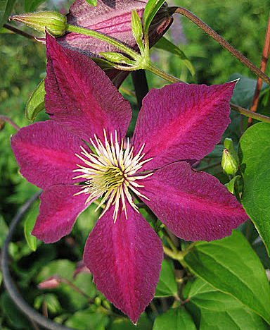 Саженцы клематиса Mikеlitе являются эстонским сортом лиан, обладающих двуцветными лепестками. Чаша соцветий простая, лепестки эллиптической формы, пурпурно-фиолетового оттенка, посреди них располагается яркая красная полоса. Особенно красиво смотрятся эти цветки в сочетании с желтыми пыльниками на белых нитях. Идеально подходит для посадки воле беседки, невысокой стены, решеток и ограждений. Клематис можно посадить в большой контейнер, откуда лиана будет расти и красиво обвивает натуральные и искусственные опоры. Сорт отличается своей неприхотливостью, способен хорошо расти на солнечном безветренном месте.
