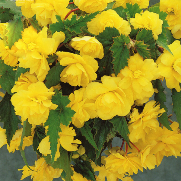 Клубни бегонии ампельной Йеллоу (Yellow) приобретают для высадки в подвесные кашпо и корзины. Побеги, длинной до 40 сантиметров, несут на себе многочисленные махровые цветочки золотисто-желтой окраски. Куст цветет очень пышно, излучая золотое сияние и поднимая настроение даже в пасмурный день. Высота бегонии не превышает 25 сантиметров, количество побегов на растении достигает 9 штук. Ширина раскрытых бутонов «розочек» до 8 сантиметров, сидят они на стеблях попарно. Цветение в открытом грунте длится с июня по октябрь, в домашних условиях на 2 месяца дольше.