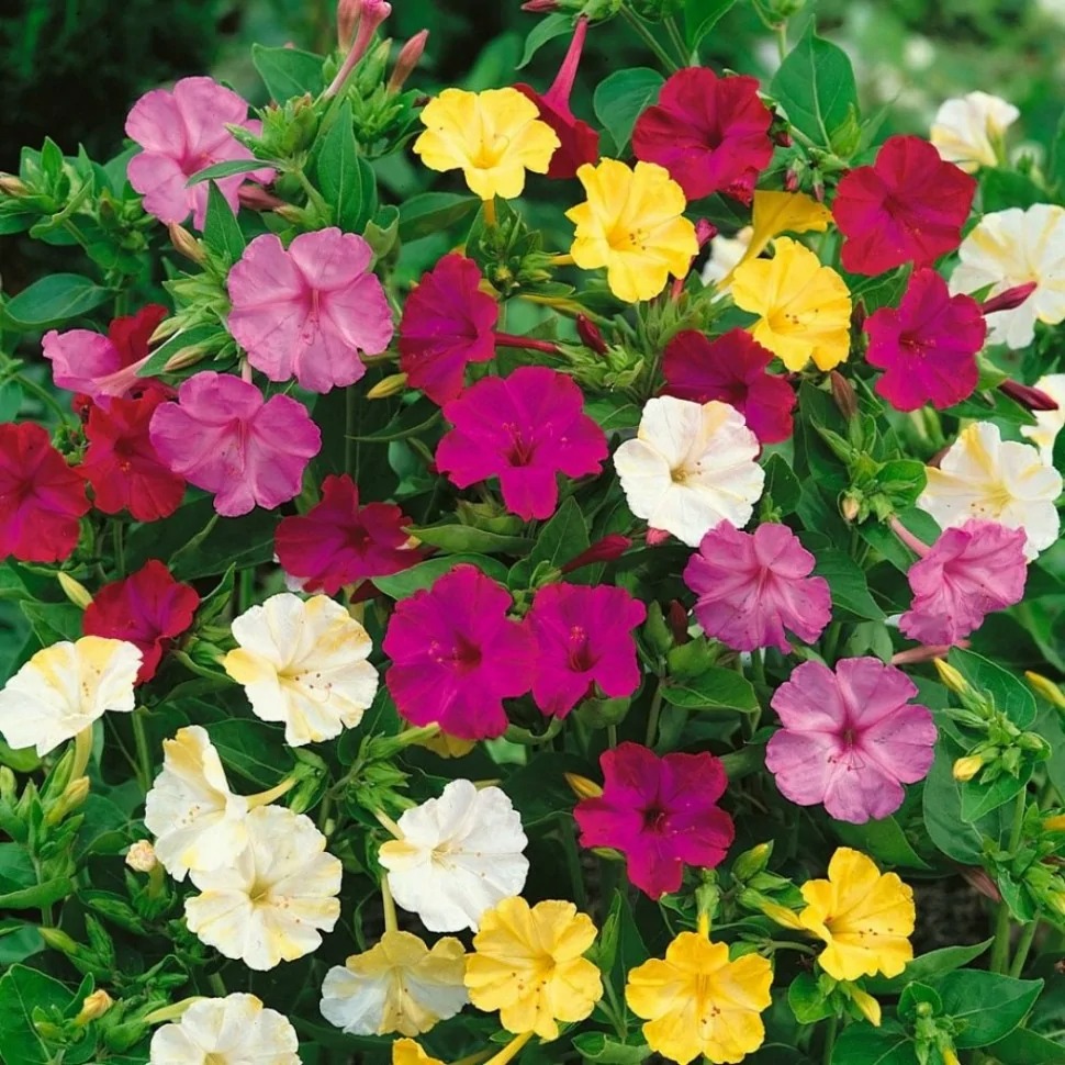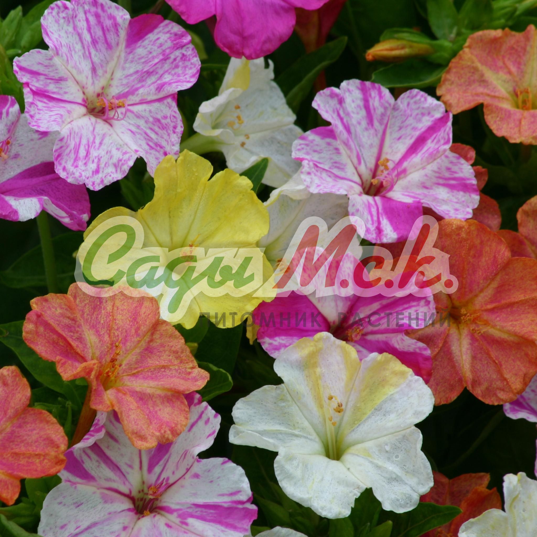 Клубни мирабилис ялапа Смесь окрасок (Multicolor) недаром называют «Ночная красавица». Неприхотливое растение раскрывает бутоны только вечером, распространяя по саду чарующий нежный аромат. Некрупные воронковидные цветочки многочисленные, собраны в соцветия. Бутоны окрашены в разнообразные цвета: белый, желтый, оранжевый, сиреневый, малиновый, розовый, фиолетовый. На некоторых лепестках присутствует штриховка. Высота мирабилиса достигает метра. Цветение начинается в конце июня и длится до холодов. Мирабилис ялапа Смесь неприхотливо, но для пышного цветения нуждается в плодородном грунте.