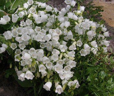 Колокольчик ложечницелистный Alba - миниатюрный белый колокольчик. Не очень крупные пониклые махровые, белые цветки появляются в начале июня, и уже через неделю ярко-зеленый ковер буквально тонет в их изобилии. Волна массового цветения медленно отступает только через полтора – два месяца, но отдельные цветки можно видеть и поздней осенью. Разрастаясь, куст образует коврик высотой 5-10 см.