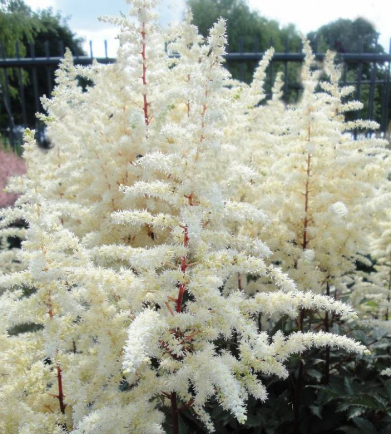 Астильба Арендса Хэппи Спирит имеет темно-красные стебли и маленькие перистые цветки белоснежного окраса. Раскидистый куст может вырасти до 40-60 сантиметров в высоту. Рассада высаживается в тенистых участках возле водоема или в любое место с влажной почвой. Астильба Happy Spirit зимостойкая, уход за ней не требует больших усилий. Посадку следует удобрять перегноем. В случае если саженец был посажен в сухой грунт, его следует регулярно и обильно поливать. Астильба Арендса Хэппи Спирит особенно красиво смотрится в массивных городских посадках, среди кустарников, под деревьями или в небольших моно-группах.