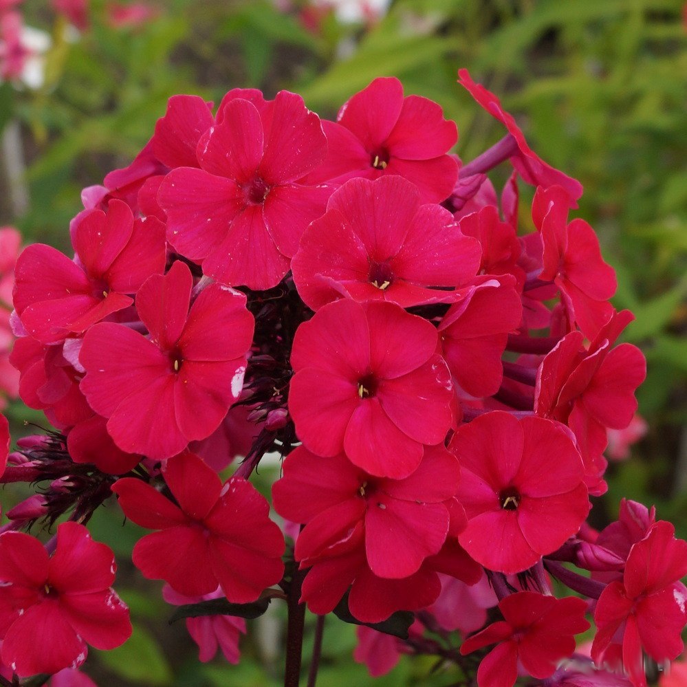 Флокс метельчатый Надя - высота куста до 80 сантиметров. Период посадки весной или ранней осенью, лучшие сроки весенней посадки — первая половина мая, а осенней — третья декада августа — первая декада сентября. Соцветие плотное. Цветок малиново-красный, глазок чуть темнее, не выгорает на солнце, ароматный, листья светло-зеленые. Для посадки выбирают слегка притенённые места, с влажной почвой, богатой питательными веществами и удобренной навозом. Флоксу метельчатому Надя необходимы подкормки, рыхления и обильный полив (почва должна быть всегда влажной, но не переувлажнённой).