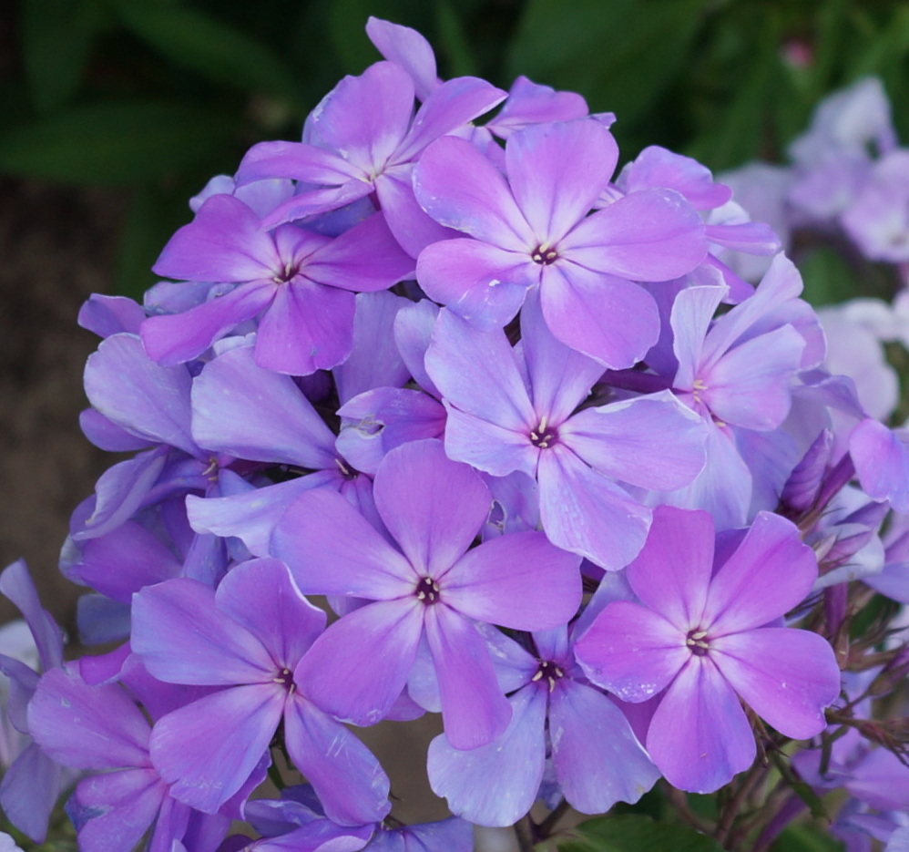 Флокс метельчатый Незабудка - просто незабываемая окраска! Соцветия из атласных цветков редкого сиренево-голубого оттенка с фиолетовыми бликами и пурпурной звездочкой в центре. Зацветает в 20-х числах июля. Флокс метельчатый Незабудка отлично размножается и не болеет, высота растения 70 см.