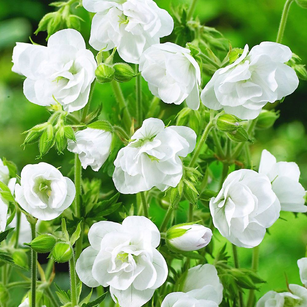 Герань луговая Лаура (Geranium pratense Laura) понравится любителям махровой обильной зелени и нежных ненавязчивых бутонов. Размер куста около 60 см, широкие листья сильно рассечены, цветки мелкие махровые чисто-белые, 4 см в диаметре, кистевые соцветия на стеблях поднимаются выше уровня зелени. Многолетние цветы хороши для бордюрных и групповых посадок в открытом грунте на дренированных, богатых питательными веществами почвах. Они предпочитают теневые и полутеневые места с отсутствием сквозняков. Герань луговая Лаура зимует в почве при выращивании в 4 зоне морозостойкости, в других районах требуют выемки на период холодов.