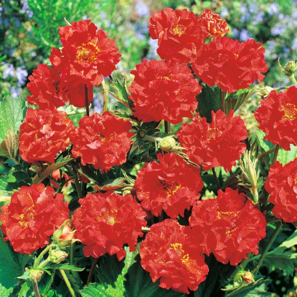 Гравилат чилийский Блейзинг Сансет (Geum chiloense Blazing Sunset) принесет в сад мазки яркости и шарма. Солнцелюбивое многолетнее растение хорошо приживается на плодородной, влажной, дренированной почве. Высота до 60 см, период цветения начинается в июне и продолжается все лето. Цветки ярко-красные, диаметром около 3 см, махровые с большим количеством кудрявых лепестков и множеством ярко-желтых тычинок на темной серединке. Гравилат чилийский Блейзинг Сансет часто используется для групповых посадок в смешанных композициях и ранним цветением начинают ряд синхронизированных по времени цветущих линеек.
