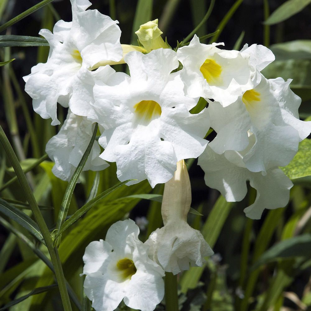 Корни инкарвиллеи Делавея Сноутоп (Incarvillea delavea Snowtop) редкие гости в отечественных цветниках из-за невысокой зимостойкости. Решить проблему с зимовкой можно выращивая Делавею в контейерах. Инкарвиллея Делавея Сноутоп каждую весну отращивает темно-изумрудную ажурную зелень и выбрасывает невысокие цветоносы, увенчанные крупными бутонами. Форма цветка напоминает бутон глоксинии или петунии. Высота инкарвиллеи Сноутоп от 30 до 55 сантиметров. На цветоносе раскрывают крупные воронковидные цветки ослепительно белой окраски, с желтым глазком в глубине горловины.