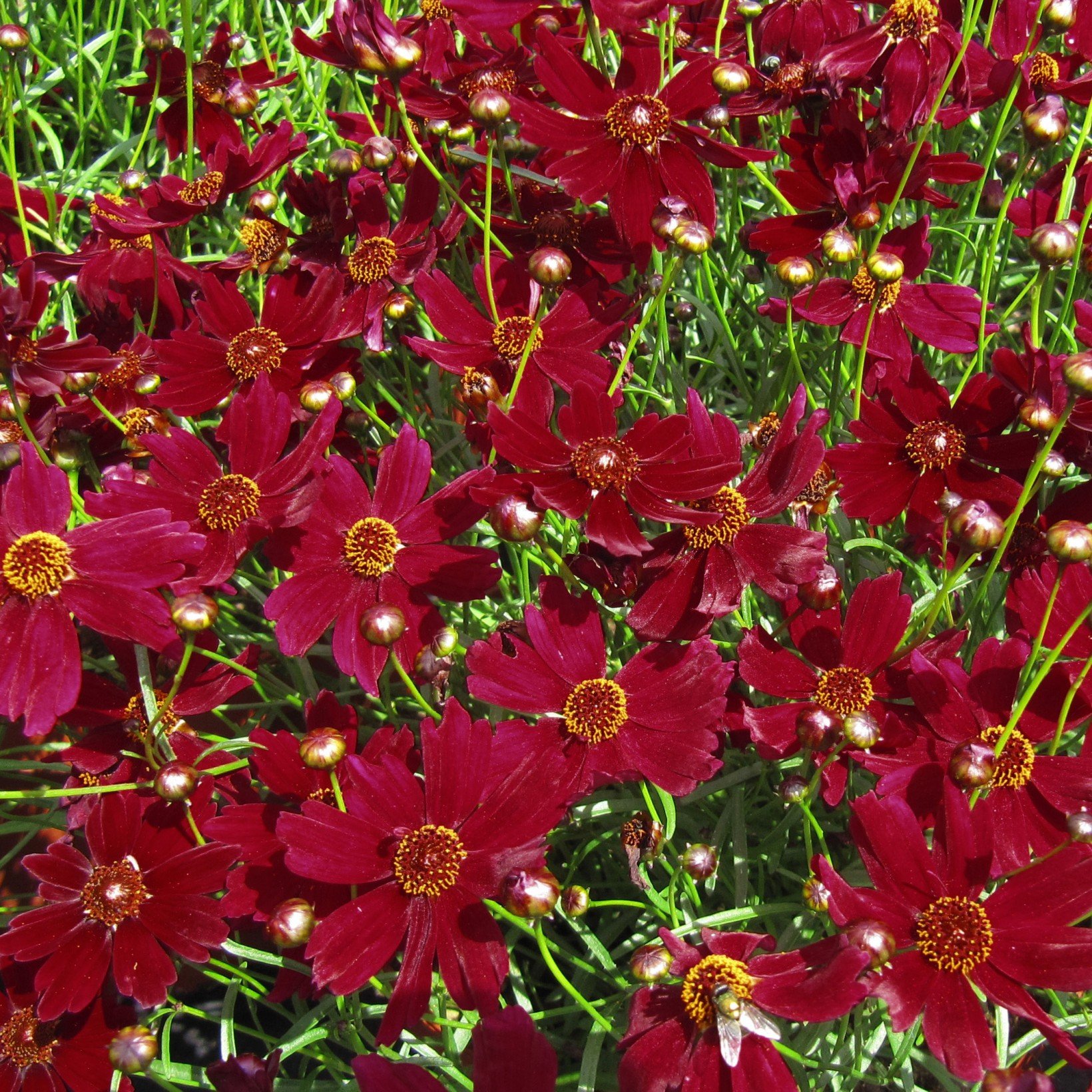 Кореопсис мутовчатый Руби Ред вырастает до 1 м в высоту. Цветки насыщенного красного цвета, с горчичными серединками. Очень красиво сочетаются со светло-зелеными игольчатыми листьями. Лепестки язычковые, изогнуты вниз. Период цветения – с июля до середины сентября. Кореопсис мутовчатый Руби Ред можно использовать для букетов.