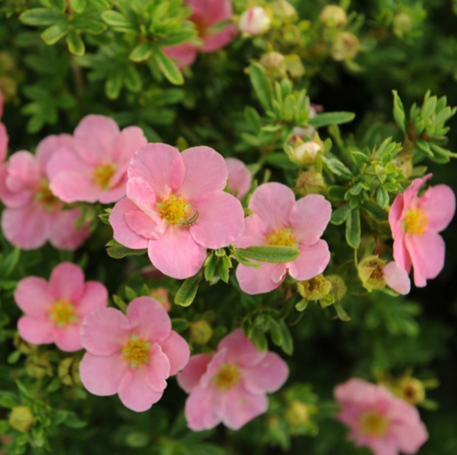 Корни лапчатки кустарниковой Pink Queen на вашем участке вырастут в приземистый, широкий кустарник, с пышной подушковидной кроной. Размеры не превышают 60–80 см в высоту, диаметр кроны около 1 метра. Сложные листья жёлто–зелёного цвета, 2-3 см длиной, плотно растут на гибких побегах. Цветет Pink Queen всё лето. Распускаясь в конце мая, цветы стоят, практически, до заморозков. Достаточно крупные цветы имеют нежно – розовый цвет, в жару – белесоватый. Саженец крупномера Pink Queen- неприхотливое растение, зимоустойчивое и устойчивое к засухе. Хорошо растёт на суглинистых, влагопроницаемых почвах. Пышность цветения прямо зависит от освещённости.