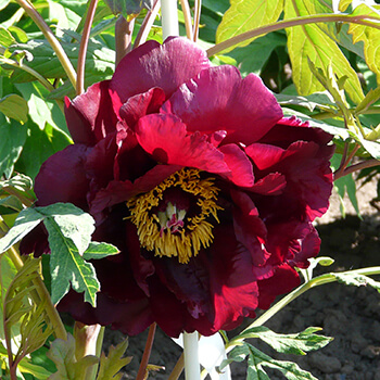 Древовидный пион Black Panther большой полумахровый. Лепестки глянцевые, интригующего темно-красного оттенка. Тычиночные нити красные, пыльники ярко – желтые, рыльца красные, диск темно – красный. Размер цветка до 20 см. Стебли прочные.<br>