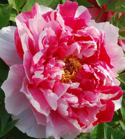 Древовидный пион Shima Nishiki эффектный полумахровый, может быть абсолютно белым, ярко красным или иметь тёмно-розовые и красные полосы на белом. Диаметр цветков 16-18 см. Аромат слабый, но очень приятный. Стебли прочные, прямые, цветы на них не поникают. Цветение средне-раннее. Морозостойкость средняя, поэтому желательно сажать такой пион в защищенном от ветров, солнечном месте.