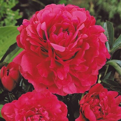Травянистый пион Karl Rosenfeld относится к травянистому классу с плотными, полумахровыми цветами, невероятно красивыми соцветиями диаметром до 18 см, темно-рубиновый с неровными краями лепестков. Сложен цветок из правильно расположенных вогнутых лепестков, как из чешуек. Цветоносы пиона очень устойчивы и не требуют опоры высотою до 85 см, благодаря чему куст сохраняет свою форму и не разрушается под весом крупных цветков. Ажурная пышная рассеченая листва сохраняется до поздней осени, становясь из темно-зеленой багряной.