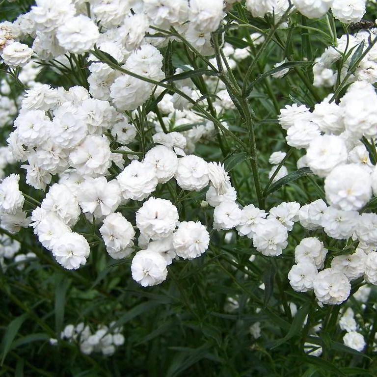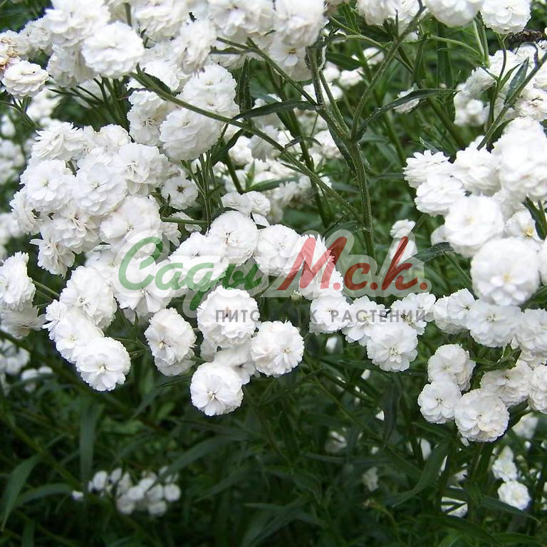 Тысячелистник птармика Вайт Перл (Whit Pearl) рекомендуется высаживать в рокарии, альпинарии, в бордюрном цветнике и на смешанной клумбе. Неприхотливый многолетник образует плотные раскидистые кустики, всю вторую половину лета покрытые мелкими шаровидными махровыми цветками ослепительно белого цвета. Бутоны расположены на стеблях в таком количестве, что заслоняют собой листву – словно россыпи белого жемчуга покрывают куст. Высота тысячелистника не превышает 70 сантиметров. Цветение продолжается с июля по сентябрь. Тысячелистник птармика Вайт Перл морозостоек, не требователен к почвам, быстро разрастается.