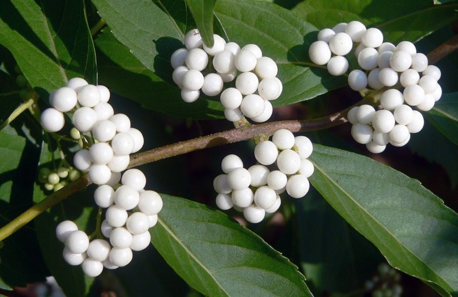 карпа японская Леукокарпа - привлекательный кустарник, с белыми ягодами. Летом он имеет довольно бледные розово-белые цветы, контрастирующие с темно-зелеными листьями, которые перед падением осенью меняют оттенки бледно-желтого и бронзового.Кустарник смотрится очень нарядно, высаживается как солитер или в группе с другими декоративными кустарник