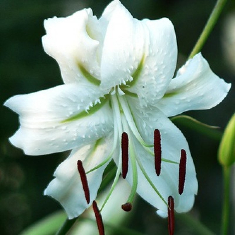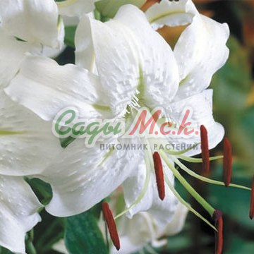 Лилия Album - прекрасная белая лилия, в буквальном смысле слова. Цветки ярко- белые, покрытые рельефными крапинами и штрихами. Лепестки, сильно завернутые вверх, образуют чалмовидный цветок диаметром до 15 см, с насыщенным ароматом. В одном соцветии - от 2 до 20 цветов. Период цветения - конец июля- сентябрь . Высота растения до 200 см.