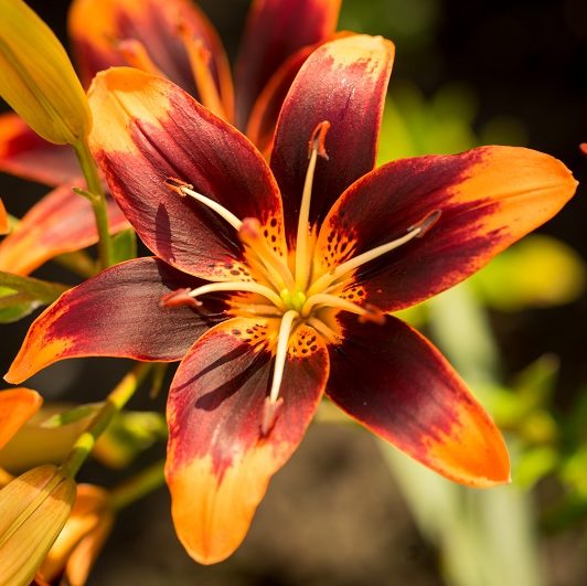 Луковицы азиатской лилии Форевер Сьюзан (Lilium asiatic Forever Susan) принадлежат к двуцветным сортам. Высота стеблей около 0,8 м. Диаметр цветков до 14 см. Основная окраска оранжевая. По центру лепестков большие сливово-черные мазки, ближе к серединке такого же оттенка крап. Лепестки остроконечные, плотные. Пыльники бордовые. Время цветения – июль. Лилии выдерживают понижение температуры до -40 °С. Засухоустойчивые, но все же в период бутонизации лучше обеспечить им умеренный полив. Лилия азиатская Форевер Сьюзан не требовательна к почве, может расти даже на плотных грунтах. Выращивается на срез и для украшения клумб.