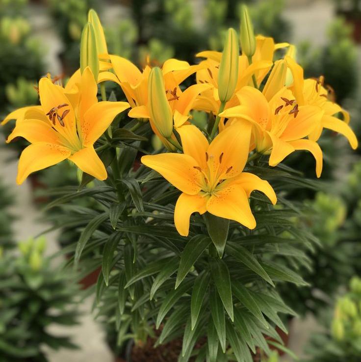 Луковицы азиатской горшечной лилии Тайни Глоу (Lilium asiatic Tiny Glow) гармонично выглядят как в групповых, так и в одиночных посадках. Высота стеблей не превышает 35-40 см. Цветки крупные, в диаметре до 16 см. Окраска насыщенная желтая. От центра по лепесткам проходит чуть заметное оранжевое напыление. Пыльники коричневатые. Зацветает в июне-июле. Лилия нетребовательна к уходу, устойчива к низким температурам, болезням. Поэтому может выращиваться в горшках и в открытом грунте. Для лучшей бутонизации желательно высаживать Лилию азиатсую горшечную Тайни Глоу на открытых участках или в полутени. Лилия любит умеренный полив.