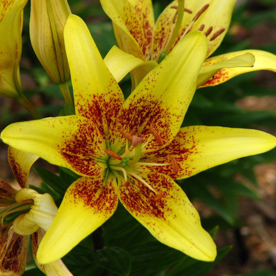 Луковицы Лилии азиатской Жуан-Песоа (Lilium Joao Pessoa) превратятся в низкорослое (до 40 см в высоту) растение, которое удачно компенсирует свой небольшой рост великолепным цветением. Ярко-желтые лепестки цветков помечены темно-бордовыми пятнами у основания, образующими кольцо. Яркое сочетание красок жизнерадостно встречает утром в саду, оживляет пространство дома во время цветения на подоконнике или балконе. Лилия азиатская горшечная Жуан-Песоа специально создана для того, чтобы поднимать настроение. На обильное и продолжительное цветение повлияет и место посадки. Оно должно быть солнечным и без застоя подземных вод.