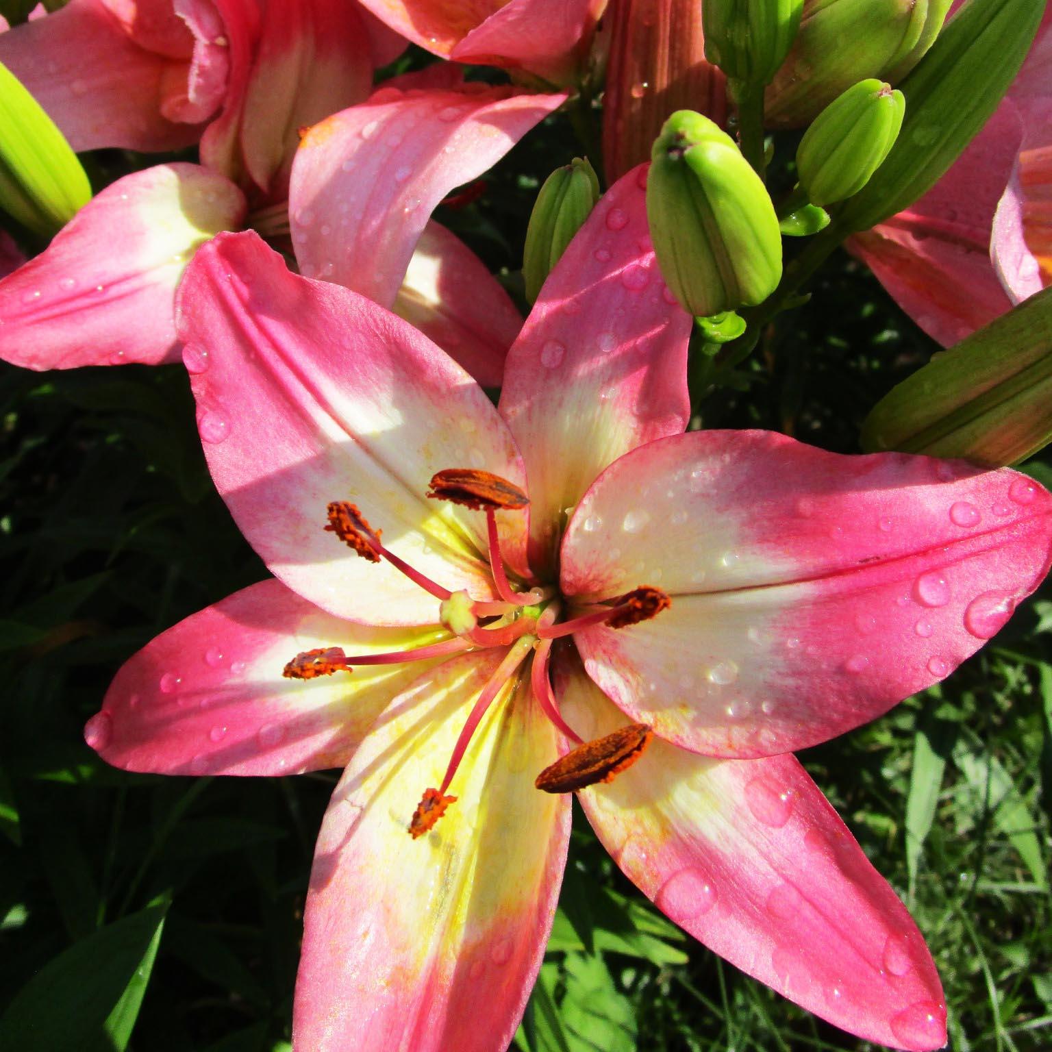 Лилия Lollypop - азиатский гибрид. Цветки двухцветные: центр лепестков белый, кончики малиновые. Диаметр 14-15 см. Соцветия небольшие, из 3-5 цветков. Высота растения 70-80 см. Сорт используется для срезки, групповых и одиночных посадок, как в грунт, так и в контейнеры.