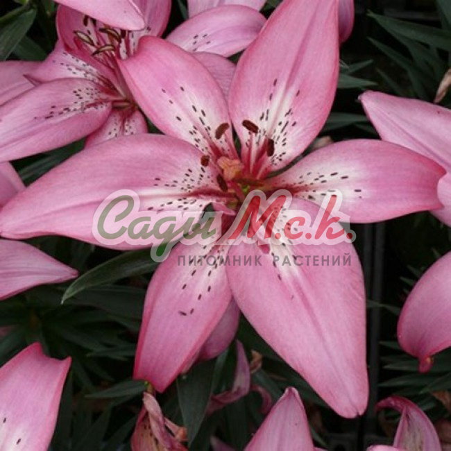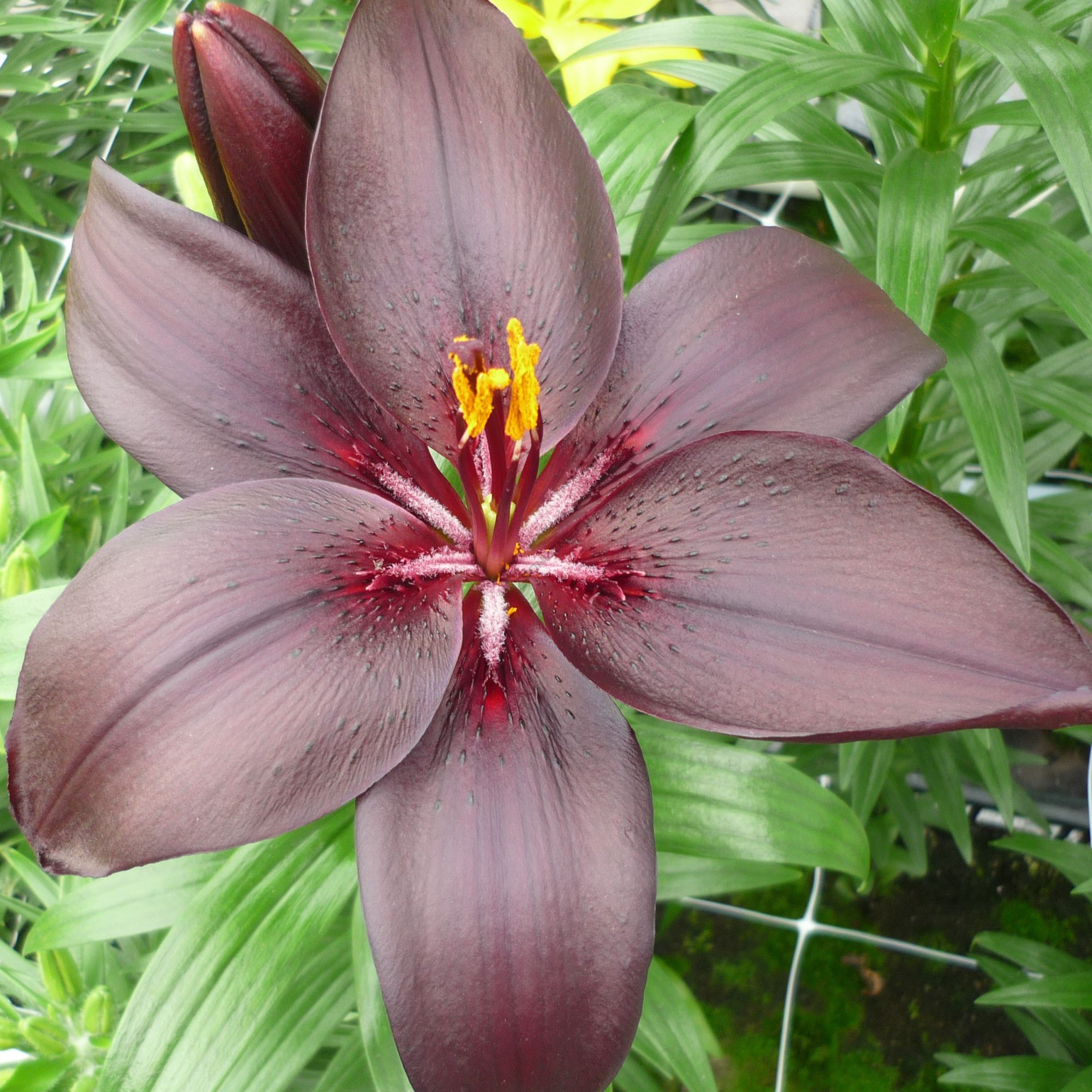 Луковицы Лилии азиатской Маскара (Lilium asiatic Mascara) ― удачное решение для клумб, на которых не хватает сочных, насыщенных темных оттенков. Цветки отличаются бордово-черным цветом с оттенками серого и фиолетового, переходящими друг в друга без четких границ, равномерно. Ближе к центру располагается россыпь черных крапинок. Эффект усиливается длинными красными тычинками с ярко-оранжевыми тяжелыми пыльниками. Именно они дарят лилии особую прелесть, придавая ей выразительность и яркость. Благородное величие Лилии азиатской Маскара полностью раскрывается на клумбе.