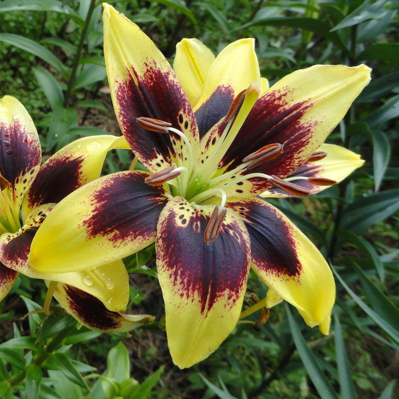Луковицы Лилии азиатской Танго Изи Данс (Lilium asiatic Easy Dance) ― еще один популярный представитель известной группы «танго», отличающийся интересной расцветкой. Характерное для сорта темное плотное пятно у Изи Данс насыщенно-фиолетового цвета, в центре можно видеть незначительный темный крап на желтом фоне. Основной цвет, покрывающий лепестки в их верхней части, светло-желтый. Эффектным фоном для этого вида могут стать лиственные и хвойные деревья, а также кустарники насыщенно-зеленого цвета. Лилия азиатская Танго Изи Данс отлично смотрится и в окружении однолетних цветов.