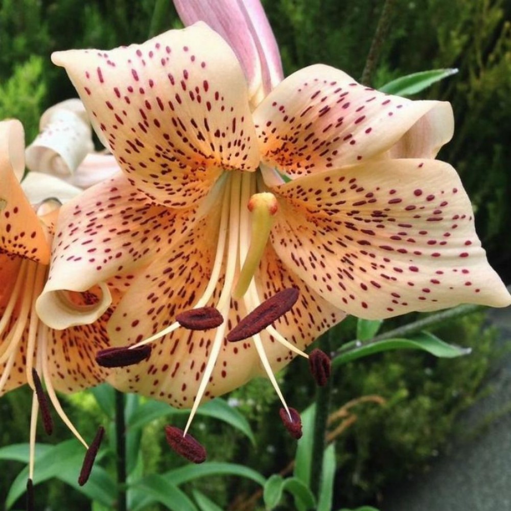 - Характеристики Светло-оранжевый, на концах лепестков светлее, с тёмно-бордовым крапом, края лепестков отогнуты назад