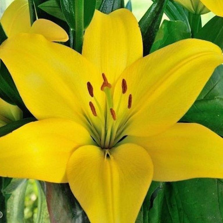Лилия азиатская Жиронда (Lilium) способна оживить даже самый бледный цветник экзотическим канареечным окрасом своих цветов. Ненавязчивым дополнением служит зеленоватая сердцевина и крупные коричневые тычинки. Высокие стебли просто укрыты массивными цветками и бутонами. Аромат приглушенный, иногда может показаться, что эти цветы вообще не издают запаха.