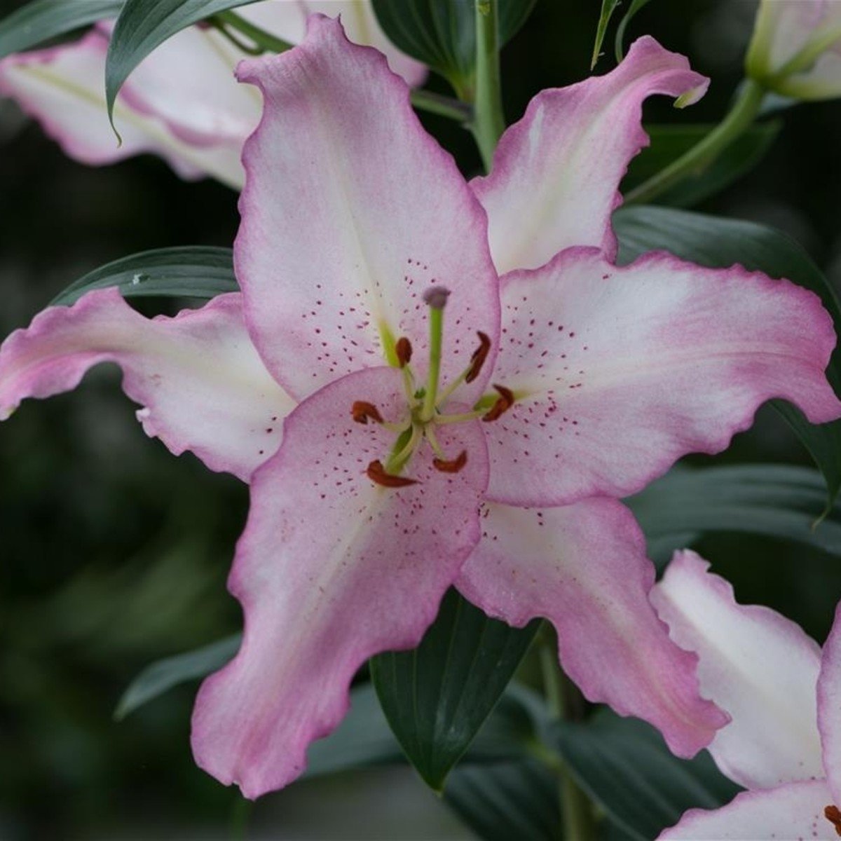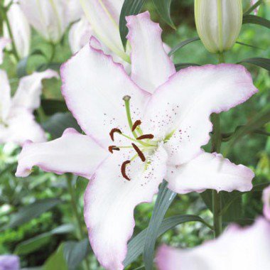Лилия Brasilia - многолетний цветок, обладающий буйством приятных красок от белого с сиреневой каймой, до белого с розовой. Цветки крупные, до 27 см в диамерте. Соцветия высотой 90см, период цветения июль-август. Лепестки лилии широкие с волнистыми краями. Сорт обладает приятным, насыщенным запахом.