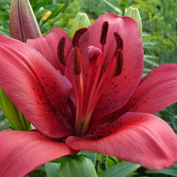 В высоту Лилия ЛА-гибрид Евфрат достигает 100-110 см. Насыщенные зеленые листья сохранят цвет до самой осени. Крупный глянцевый цветок светло-рубинового оттенка, напоминает восковую лепку. Такая фактура красиво смотрится в групповых посадках и миксбордерах. Иногда их сажают на клумбах, чтобы придать цветочной композиции изыска.