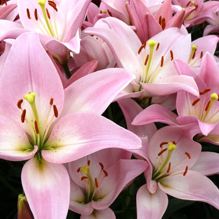 Лилия ЛА-гибрид Пати Даймонд (Lilium LA-hybrid Party Diamond) внесет в ваш сад нотки очарования. На стеблях высотой 90 см распускаются нежные цветки розового оттенка с белым основанием, оранжевыми пыльниками тычинок и лепестками удлиненной формы. Цветение приходится на июль, диаметр цветков до 17 см, запах тонкий, слабо выраженный.