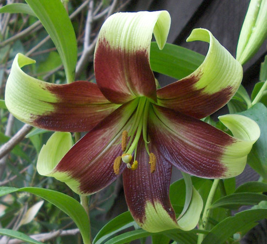 Лилия Nepalense – красивоцветущий луковичный сорт, который относится к семейству Лилейные. Высота взрослого растения составляет 100-120 см. Стебли крепкие, зеленые с коричневыми штрихами, покрыты продолговатыми (до 13 см в длину) зелеными листьями. На самой верхушке стеблей располагаются в соцветиях-кистях крупные (до 15 см в диаметре) цветки, которые имеют трубчатую форму и окрашены в зелено-желтый цвет с пурпурной серединой, ароматные. Цветение происходит в июле-августе.