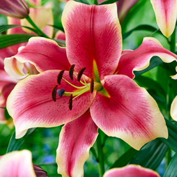 Луковицы лилии ОТ-гибрид Африкан Леди (Lilium OT-hybrid African Lady) понравятся любителям экзотики. Цветки до 22 см в диаметре – очень сложной необычной формы. Лепестки сильно загибаются в середине в направлении от центра, угол загиба слишком большой, и головка цветка в раскрытом виде производит впечатление массы широких, мягких, слегка сплющенных полос. Окраска бутона яркая, основной красно-розовый цвет переходит в кремово-желтые кончики с расширяющимся кантом. Лилия ОТ-гибрид Африкан Леди достигает 100 см в высоту, предпочитает солнечные места и богатую питательными веществами дренированную почву.