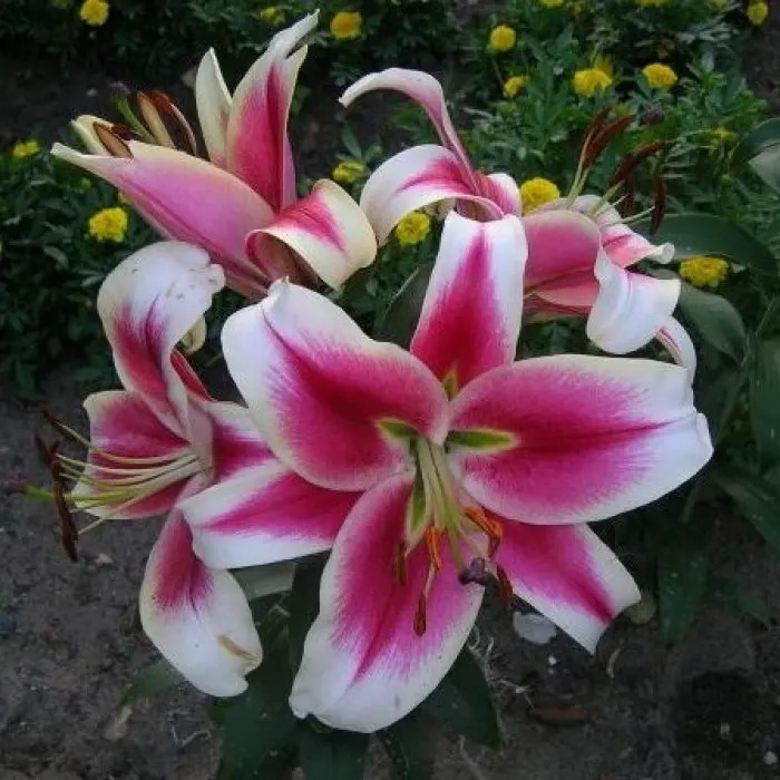 Лилия ОТ-гибрид Бон Ши (Lilium ot-gibrid Bon Chi) - растения высотой до 110 см, со стойким, но слабым ароматом. Цветки очень крупные, до 22 см, светло-розовые с ярко-розовой полосой по центральному сгибу, у основания лепестка мелкий темный крап. Форма цветка напоминает симметричную шестиконечную звезду, открываются вверх и в стороны. Цветет в июле-августе. Подойдут слабокислые или нейтральные почвы с хорошим дренажем, светлые или полутеневые места для посадки. В первый год жизни нужно укрывать Лилию ОТ-гибрид Бон Ши на зиму, затем можно ограничиться мульчированием сухими листьями.