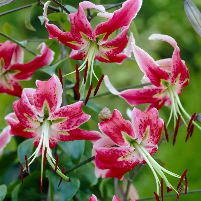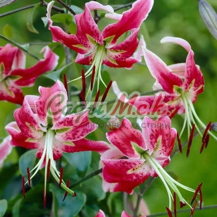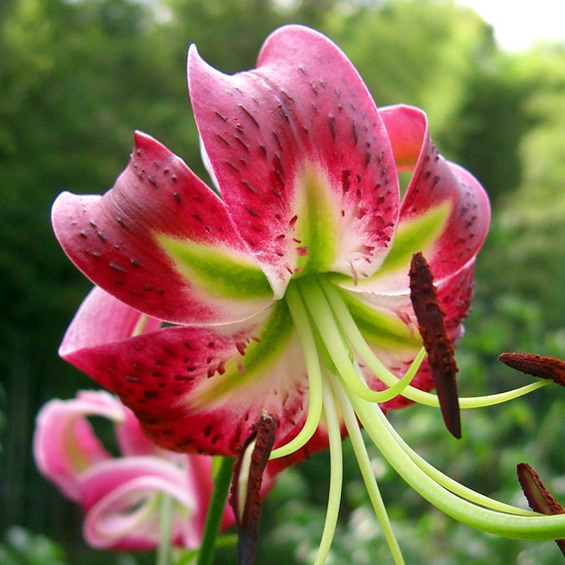 Лилия видовая Блэк Бьюти (Lilium Black Beauty) зацветет в августе. Цветы с чалмовидной головкой, направлены вниз, диаметр до 10 см. В каждом соцветии до 30 бутонов. Лепестки трехцветные, у основания зелено-желтые, далее вишнево-красные, с плотным крапом и узкой белой окантовкой по краю. Растение высокое, до 160 см, стебли прочные, облиственные, зелень густая глянцевая, темно-зеленая. Предпочитает солнечные и полутеневые места посадки с защитой от ветра, дренированные рыхлые плодородные почвы. На зиму Лилия видовая Блэк Бьюти нуждается в укрытии.