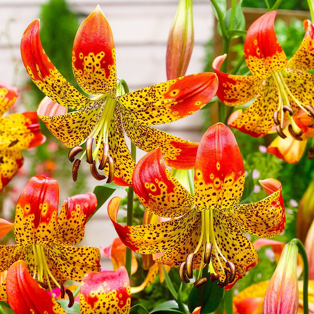 Лилия видовая Фьюжн (Lilium Martagon hybrid Fusion) относится к редким межвидовым гибридам длинноцветковых и леопардовых лилий. Растение высокорослое, может достигать в высоту 130 см. Отличается мощным стеблем. Цветки крупные (до 18 см в диаметре). Цветоводы полюбили этот сорт за очень оригинальную окраску лепестков с изумительным узором из желтых переплетений и крапом на красном фоне. У Фьюжн сильный, но ненавязчивый аромат, цветет в июле и августе. Отлично себя чувствует на солнечном месте, но переносит и полутень. Лилия видовая Фьюжн характеризуется устойчивостью к болезням и морозостойкостью.