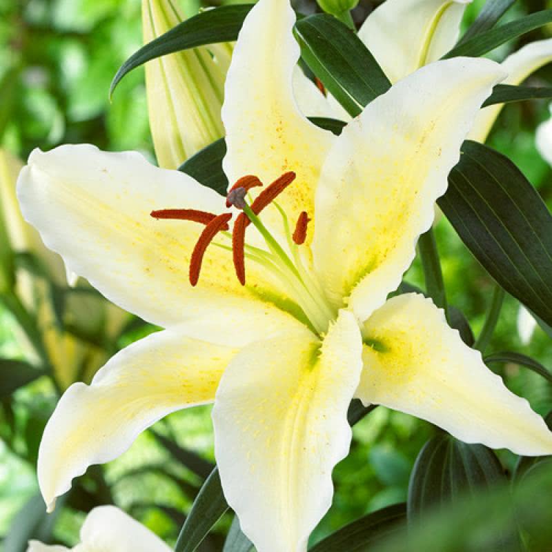Лилия восточная Чилл Аут (Lilium) – очаровательная гибридная новинка с умопомрачительным внешним видом и душистым ароматом, который усиливается в вечернее время. Этот вариант станет самым любимым цветком, который загипнотизирует своей белоснежной окраской с еле волнистыми краями и желтой жилкой по центру каждого лепестка. Заметное место в строении цветка занимают бело-желтые тычинки с коричнево-оранжевой пыльцой. Для формирования прочного и мощного стебля, а также организации обильного цветения рекомендуется проводить подкормку Лилии восточной Чилл Аут три раза за сезон и пересадку на новое место раз в 3-5 лет.