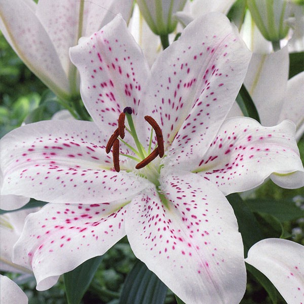 Лилия восточная Экстраваганзам (Lilium Oriental Hybrid Extravaganza) не уступает по красоте цветков и популярности даже розе – королеве цветов. Высота стеблей этого сорта – 120 см, диаметр крупных цветков – 25 см. На одном стебле распускаются одновременно до 9 цветков. Лепестки волнистые, выгнутые наружу, молочно-белого цвета, с обильным малиновым крапом и розовыми штрихами.