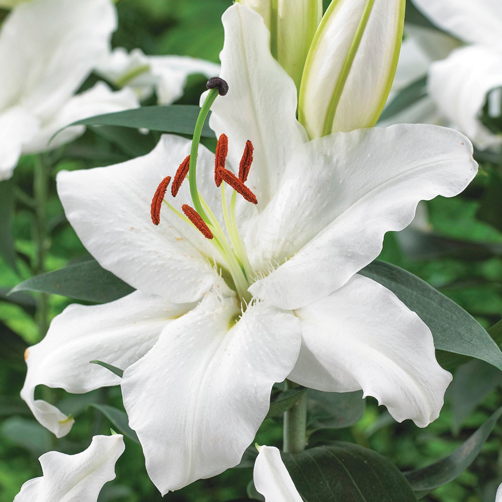 Луковицы лилии восточной Фулл Мун (Lilium hybrid oriental Full Moon) — это настоящий рекордсмен. Цветы этого сорта превышают 30 см в диаметре, дополнительно привлекая внимание ярким насыщенным ароматом. Лепестки снежно-белые, с зеленоватым оттенком у основания и контрастными оранжевыми пыльниками. Благодаря прочным бутонам и мощным стеблям букеты с добавлением этого сорта долго не осыпаются. Лилия восточная Фулл Мун — отличное приобретение для новичков. Даже при минимальном уходе Лилия восточная Фулл Мун вырастает крупной и обильно цветет. Достаточно выделить ей место на хорошо освещенном участке, периодически поливать и подкармливать удобрениями, а на зиму прятать под укрытием от морозов.