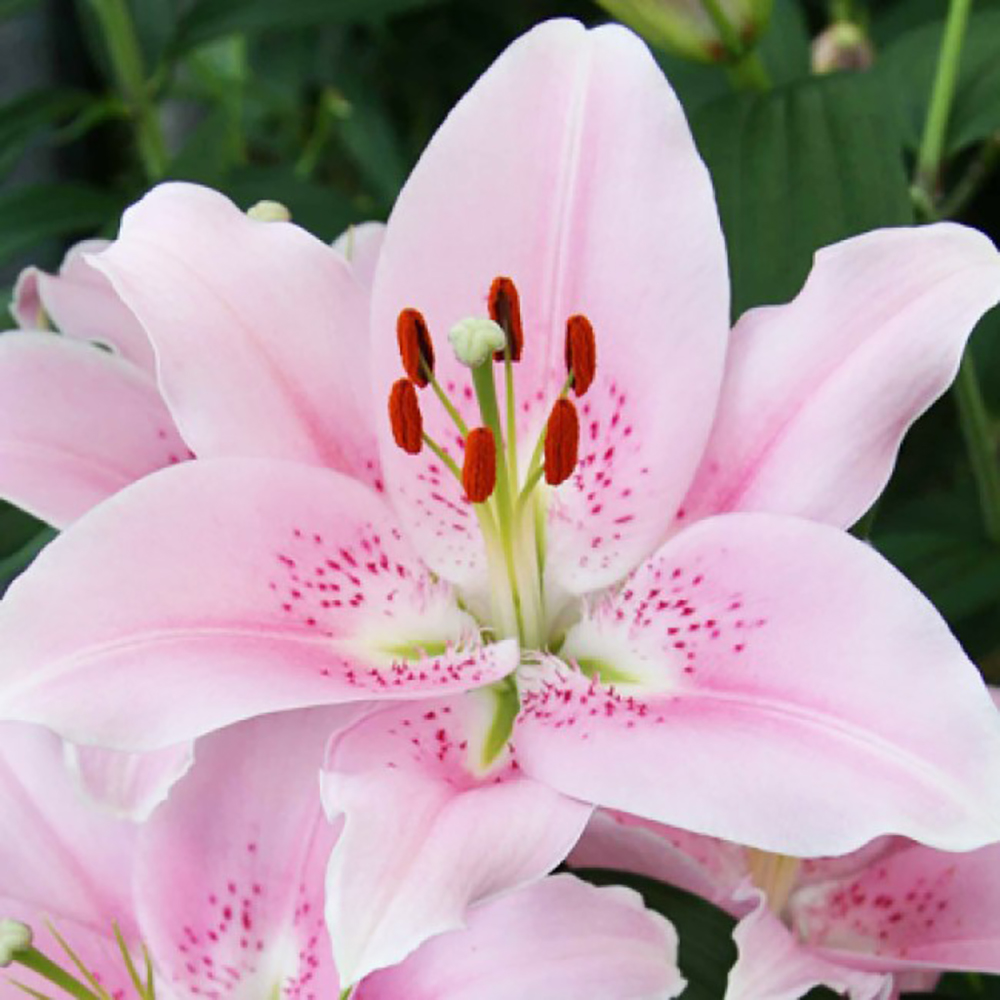 Луковицы лилии восточной Компаньон (Lilium Companion) — это находка для любителей пышных цветов и пастельных оттенков. Этот сорт отличается крупными (до 20 см в диаметре), очень ароматными цветами, которые распускаются в конце лета. Их лепестки нежно-розовые, с темным крапом на всей поверхности. Края гладкие, с незначительным осветлением. Лилия Компаньон идеально подходит для выращивания в умеренном климате. Летом она быстро растет и обильно цветет под палящим солнцем, а зимой стойко переносит заморозки. После среза цветы Лилии восточной Компаньон долго хранятся и не осыпаются при транспортировке. За счет длинного стебля (до 120 см) сорт можно использовать даже в самых крупных и вычурных букетах.