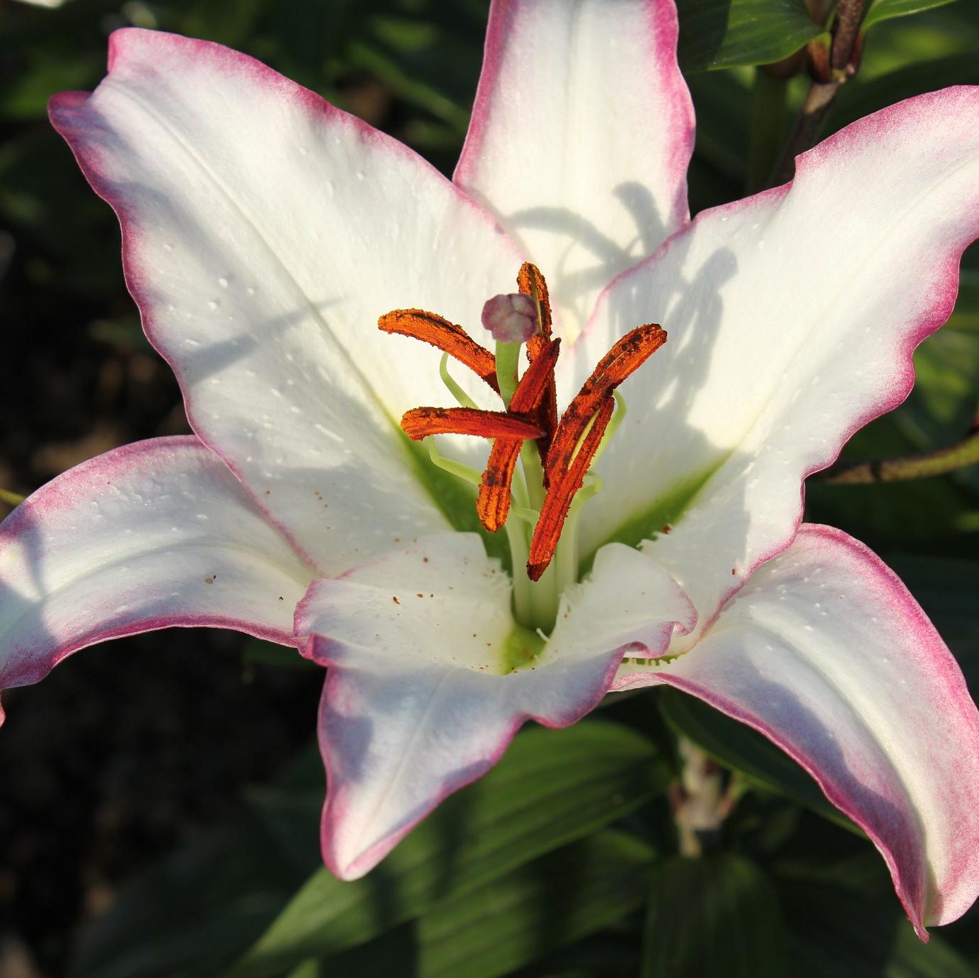 - Характеристики КРУПНЫЙ, белый с темно-розовым узким кантом на волнистых лепестках и ярко-оранжевыми пыльниками, диаметр цветка 20 см