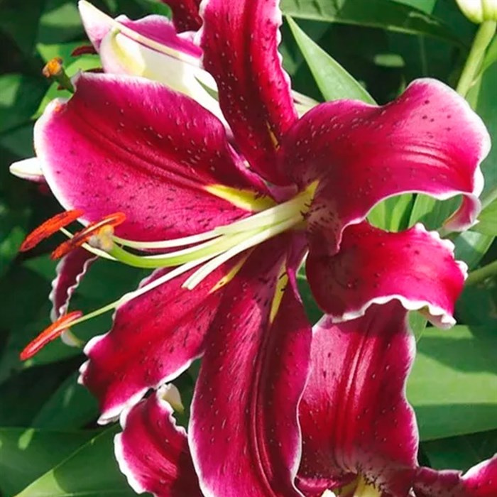 Лилия восточная Вангелис имеет цветы малиново-рубиновой окраской, с белой тонкой каймой с желтым центром и малочисленным редким темным крапом. Цветки направлены в сторону и вверх. Имеет сильный аромат. Предпочитает солнечные участки или полутень. Лилия восточная Вангелис устойчива к грибковым заболеваниям, зимостойкая.