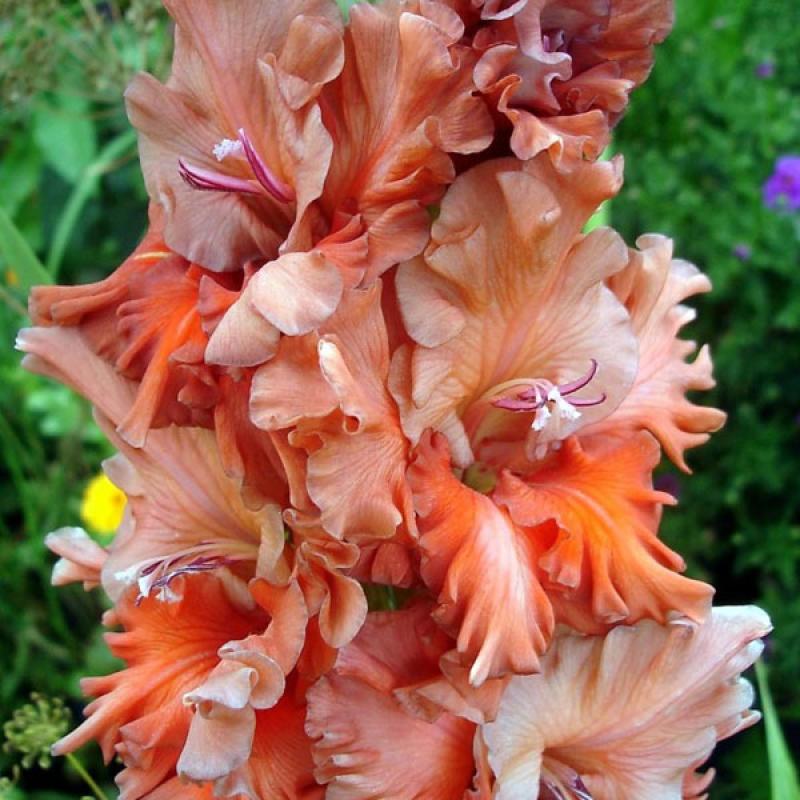 Луковицы гладиолуса Огни Городов Уфа (Ufa City Lights) пользуются популярностью у покупателей за пышное цветение и крупные гофрированные лепестки в бутоне. Цвет их нежный, лососевый. Оттенок меняет интенсивность от горловины бутона к краям лепестка, создавая объемный эффект. На этот цветок хочется любоваться бесконечно, наслаждаясь плавными переливами окраски. При высоте растения 90 сантиметров, длина колоса достигает 60 сантиметров. Одновременно на нём раскрывается около 15 бутонов диаметром до 14 сантиметров. Цветёт гладиолус Уфа с июля по сентябрь. Гладиолус гофрированный Уфа используется для срезки, он не теряет свежести в букете до 2 недель.