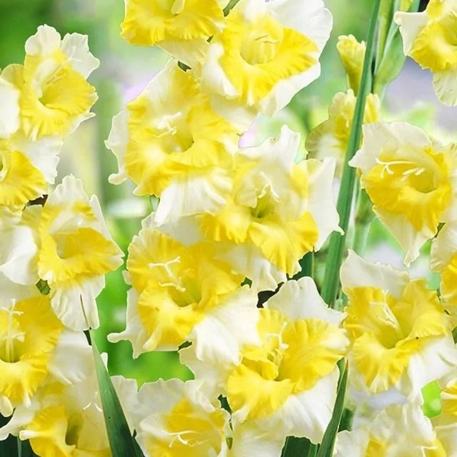Луковицы гладиолуса крупноцветкового Багги (Buggy), высаженные на клумбе, наполнят её свежестью и весенним настроением. Цветки имеют двойную окраску: белоснежная юбка и ярко-жёлтые центральные лепестки. Бутоны в точности повторяют форму и цвет нарцисса, позволяя имитировать цветение этого растения во второй половине лета. Как и все крупноцветковые гладиолусы, Багги формирует цветонос длиной более 60 сантиметров. На нём распускается до 14 цветков одновременно. Высаженные на клумбе группами по 5 или 8 штук, Гладиолусы крупноцветковые Багги выглядят живописно и празднично.