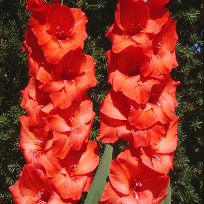 Гладиолус крупноцветковый Эдванс (Gladiolus) вырастают до 140 сантиметров в высоту. Из-за своего роста их невозможно не заметить. Стебель украшен алыми цветами диаметров до 15 сантиметров.