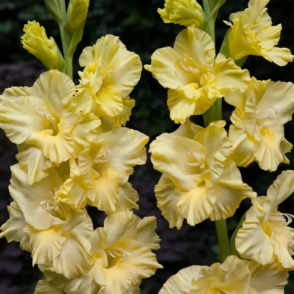 Луковицы гладиолуса крупноцветкового Морнинг Голд (Morning Gold) ослепляют в прямом смысле слова. Крупные, слегка гофрированные, воронковидные цветки отливают золотом, создавая праздничное настроение. Диаметр раскрытого бутона достигает 15 сантиметров, на цветоносе их раскрывается до 12 штук. Золотой гладиолус станет главным акцентом в смешанном цветнике или выступит в роли солитера, высаженный небольшой группой на газоне. Гладиолус крупноцветковый Морнинг Голд пригоден для выращивания на срезку. Высота растения 90 сантиметров, колос достигает размера 60 сантиметров.