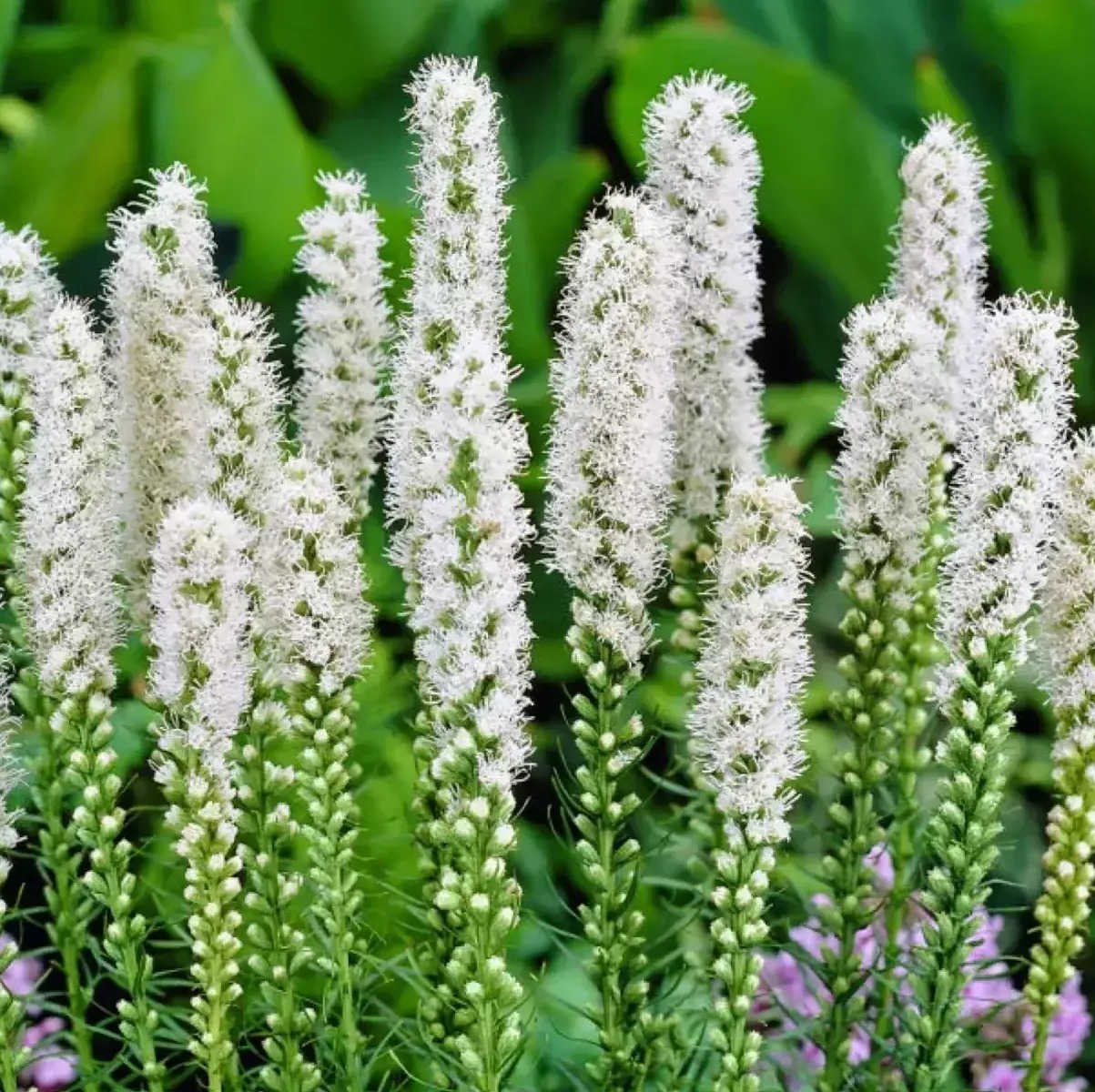 Лиатрис колосковый Альба - оригинальное многолетнее растение с клубневидными корневищами. Листья линейные. Высота растения 50 см. Цветки собраны в сложные соцветия: колос или метелку. Окраска белая. Цветки в соцветии раскрываются сверху вниз. Цветение июль-август.